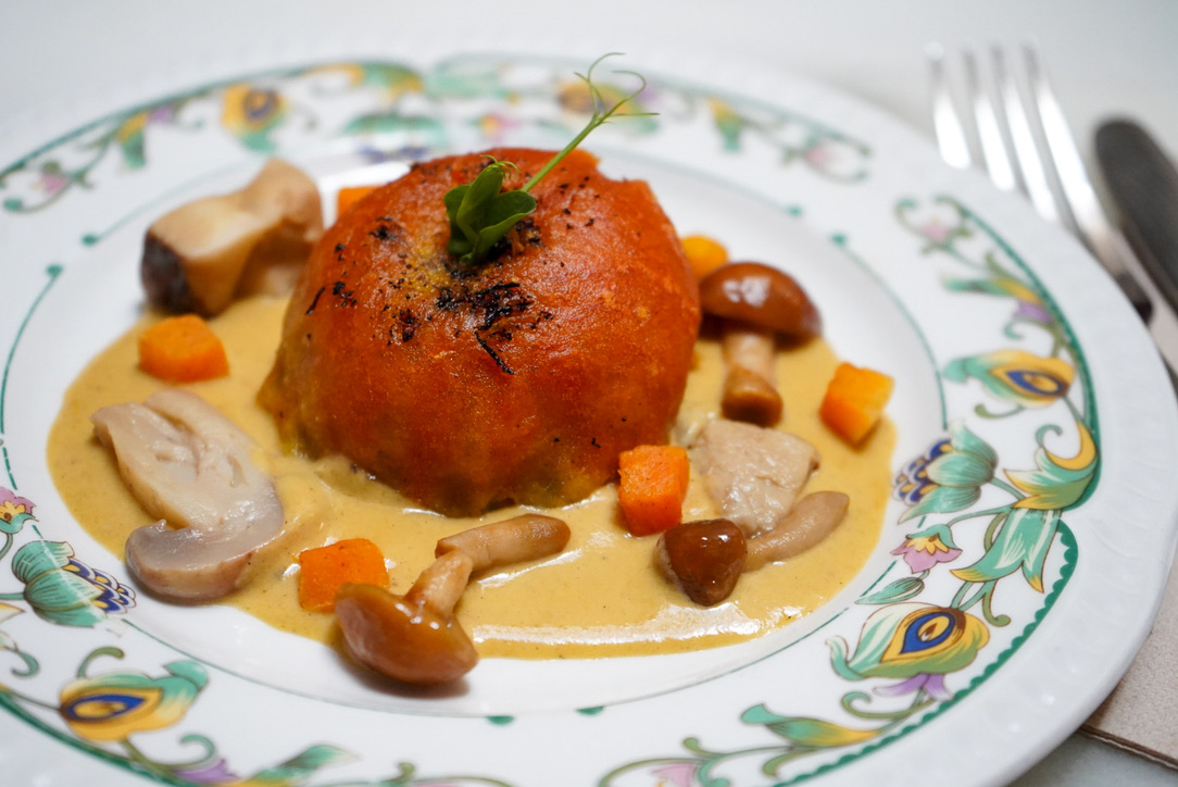Pues una tierna y jugosa carrillada al oloroso que envolvemos en una tempura crujiente y la servimos sobre un fondo cremoso de setas y calabaza salteada.